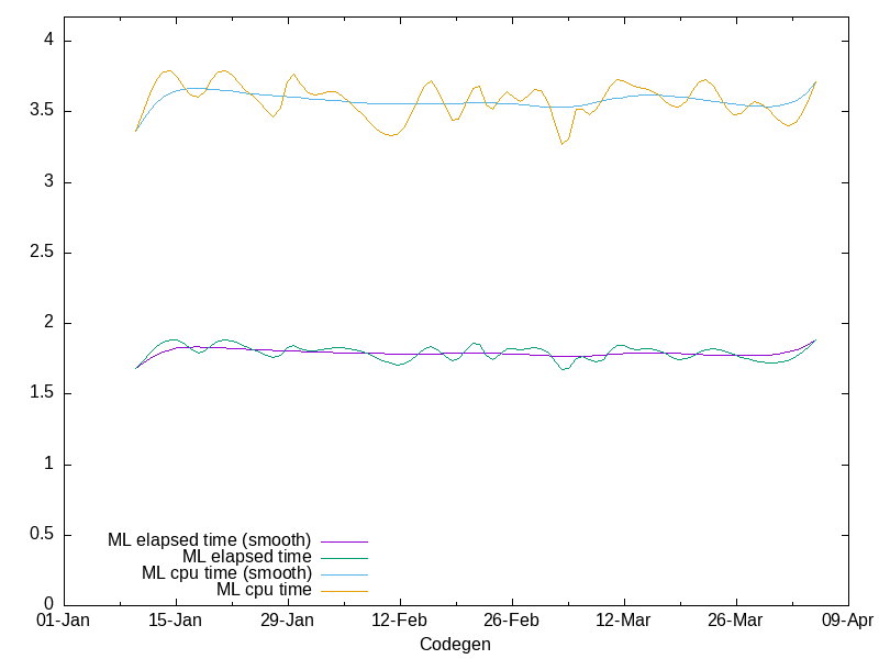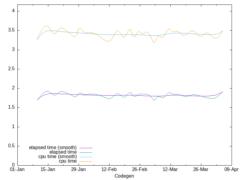 - Codegen (0:01:55 elapsed time, 0:03:30 cpu time, factor 1.83)