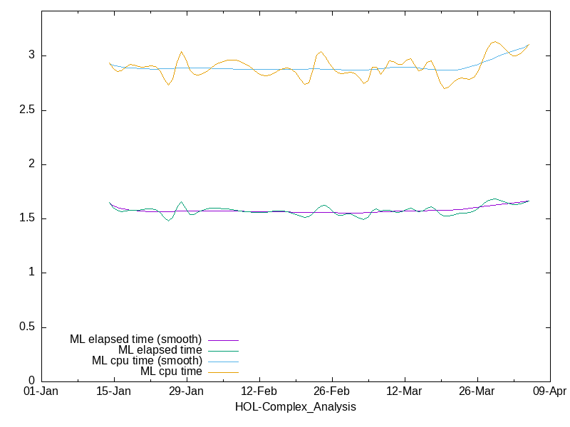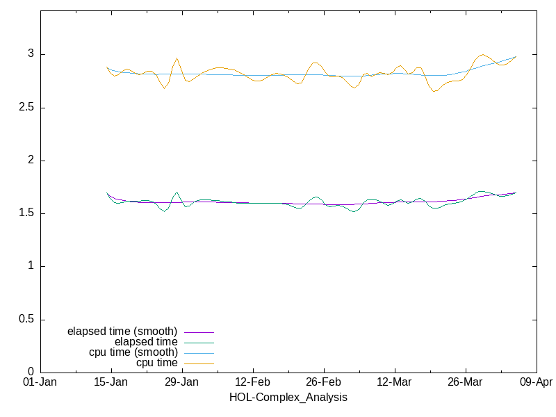 - HOL-Complex_Analysis (0:01:42 elapsed time, 0:02:59 cpu time, factor 1.75)